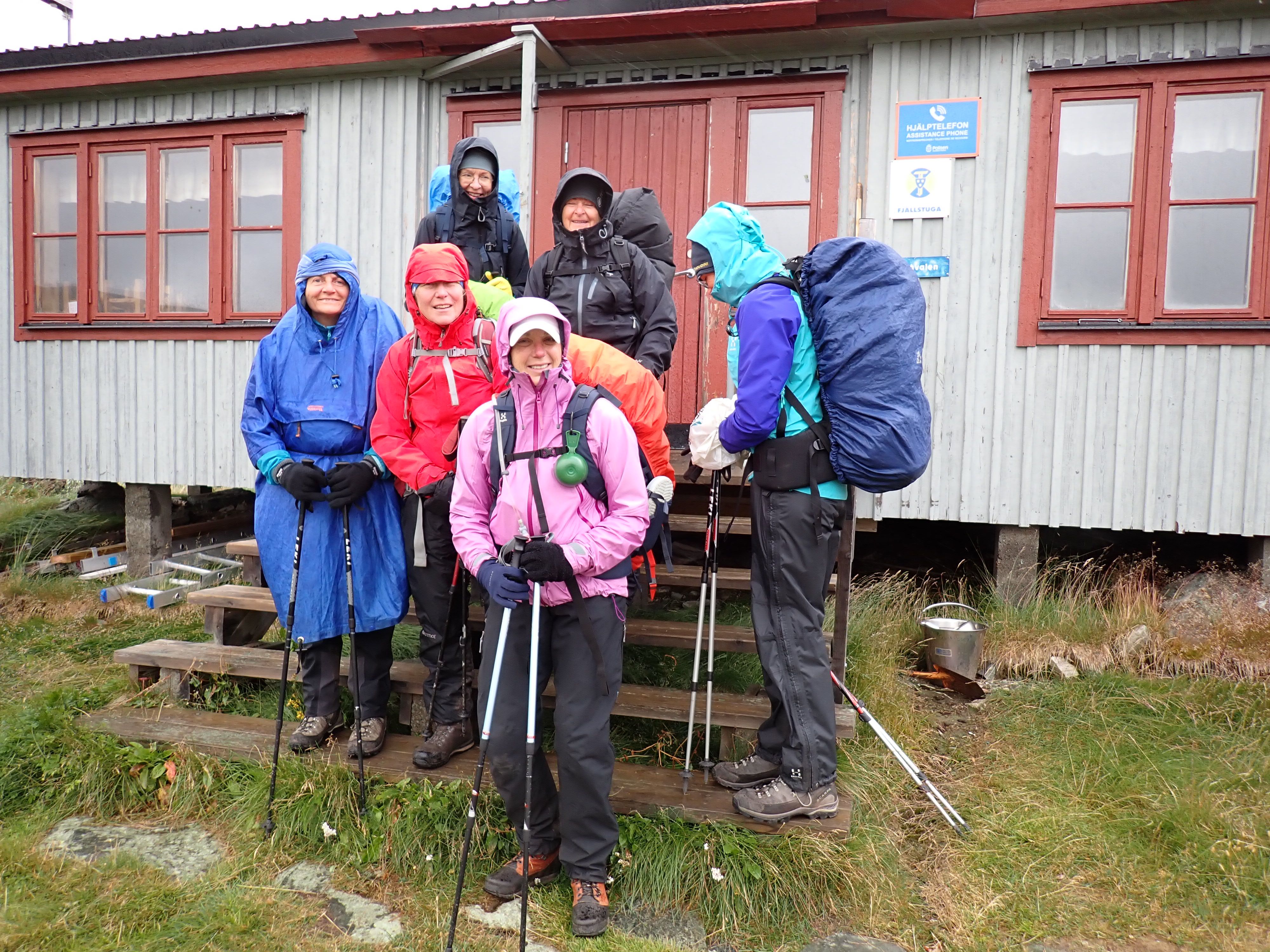 Det är två vad på vägen och där gick vi igenom och övade vadningsteknik. Efter det andra vadet brakade ovädret lös; skyfall och byvindar på upp till 20 m/s gjorde det svårt att hålla sig på stigen och vi blåste till och med av spängerna några gånger. Vi var ändå disciplinerade och stannade och åt lunch trots ovädret. Vi var väldigt glada då vi kom fram till Vålåstugorna den kvällen. På lördagen var vädret bättre, den gula varningen till trots, ovädret hade kommit tidigare än förväntat. Vi hade en fin dag i skogskanten fram till Lunndörren där vi återigen kunde njuta av en härlig bastu.