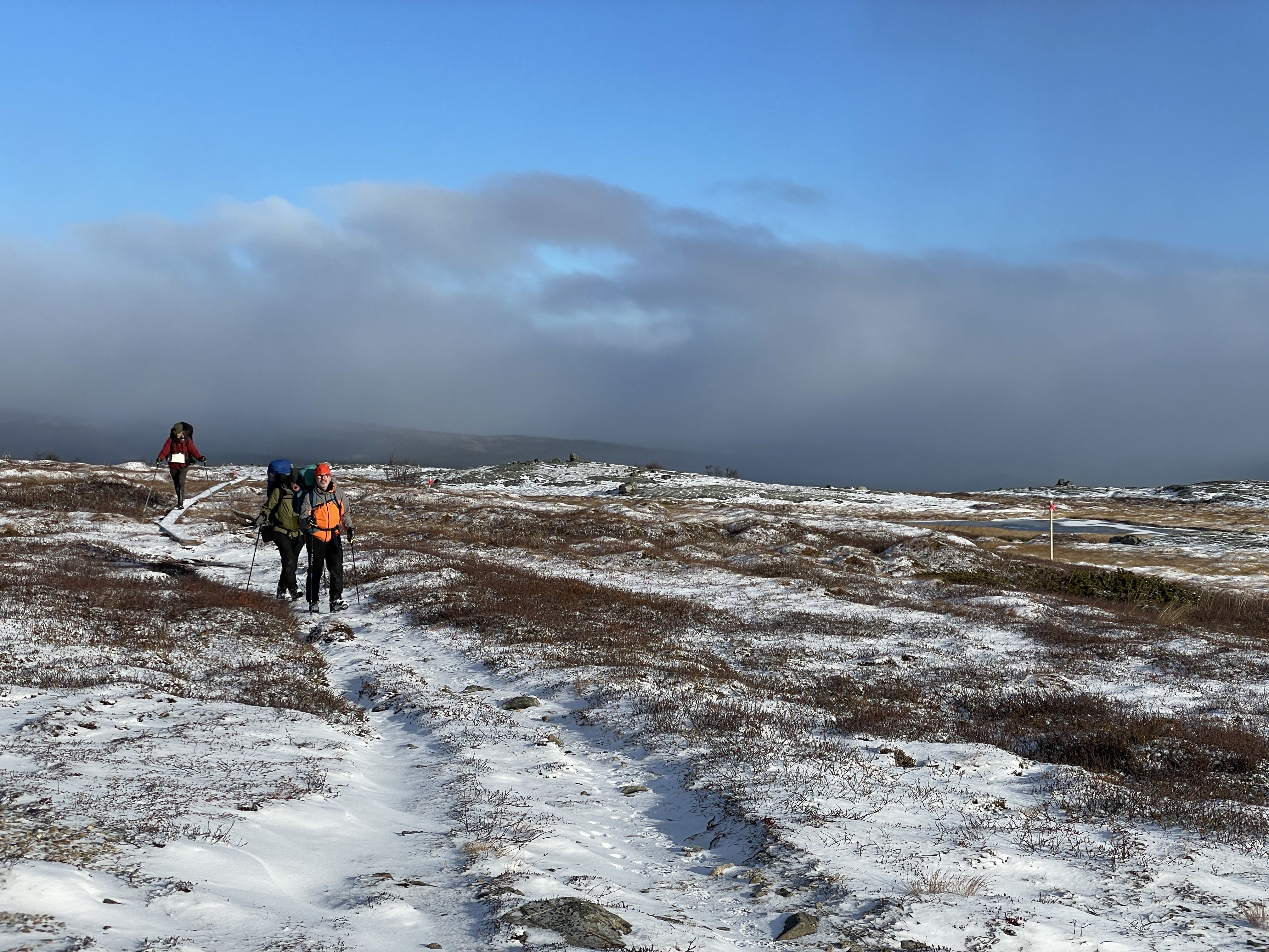 Vålådalen och sedan försöka ta den gamla leden ner mot Nulltjärn och därifrån åter till utgångspunkten i Vålådalen. Det var behagligt vandringsväder och spårsnö på marken. Det visade sig att det varit några som gått leden före oss och också använt och dragit nytta av spängerna över de blöta myrarna. Efter lite samråd kom vi fram till att det var en järv och en räv som var före oss på leden. De hade följt leden en längre sträcka men verkade ha tappat den ungefär där vi också upplevde att ledsträckningen var lite otydlig. Efter lunchpaus vid en liten bäck fortsatte vi ner mot Nulltjärnarna där västvinden tog i över vattnet. Vi passerade snabbt rastplatsen och vek in på leden mot Vålådalen. Efter två kilometer var vi vid ledskiljet mot Vålåstugorna där vi passerat två dagar tidigare. Efter ytterligare två kilometers lätt vandring på den nygrusade leden var vi åter vid parkeringen i Vålådalen. Innan vi skiljdes åt vid fyratiden på eftermiddagen tackade vi Henrik för en välplanerad och bra ledd hösttur. Sammanfattningsvis hade vi en fin och minnesvärd höstfjälltur.