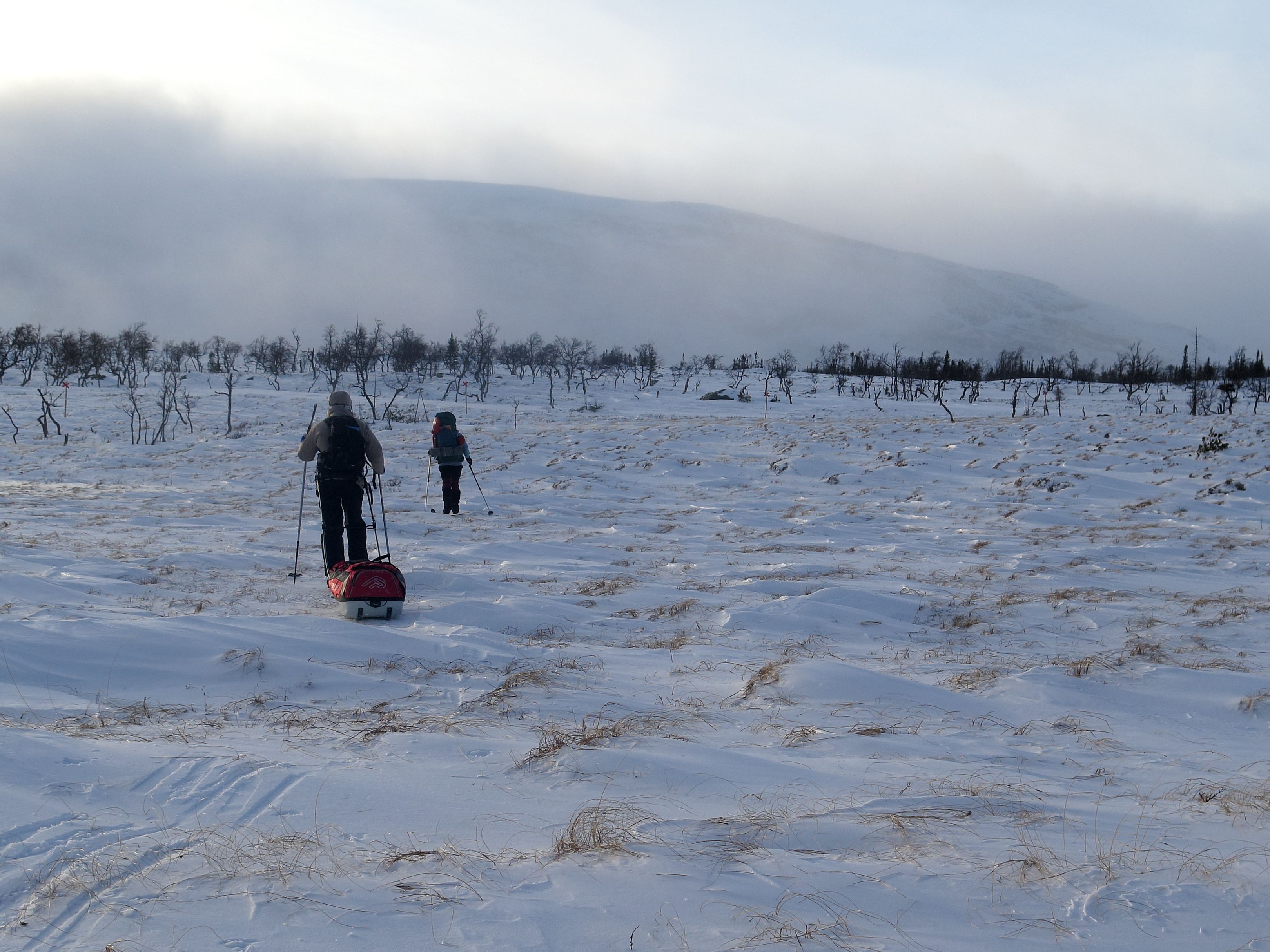 och motlut. Snön hård och skavlig. Vi faller av mot norr och granskog. Följer skoterled utan skotrar mot Ångeltjärnarna. Rundar Risåsen och passerar genom en ravin omgiven av småmyrar. Slut på skoterspåren men snön bär våra egna spår. Egna spår fritt dragna mellan myrholmar med Vålådalsskogens sedan länge döda men silvergråa snöblästrade tallar. Tallar med spretande grenar som försöker ge oss en glimt av sekler som har varit.
